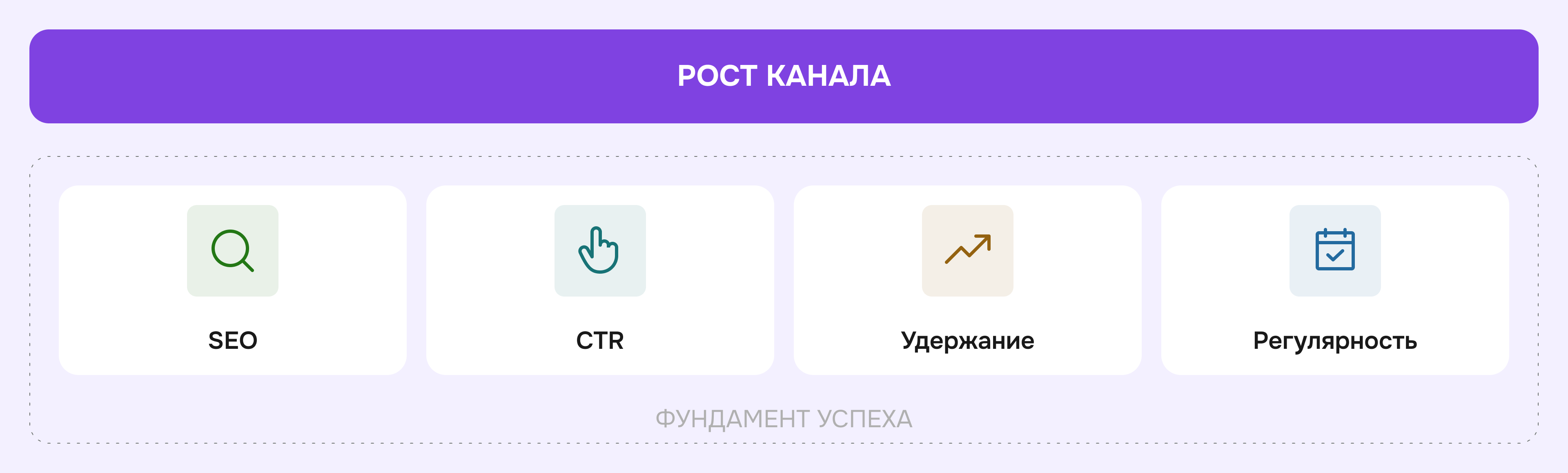 Рост YouTube-канала определяется четырьмя факторами: SEO для поискового трафика, CTR обложек для кликов в рекомендациях, удержание для попадания в алгоритмические рекомендации и регулярность публикаций.
