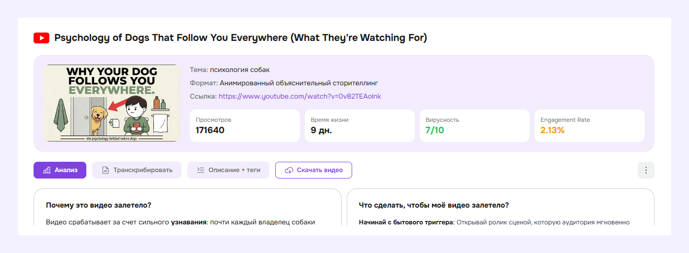 ИИ-анализ видео в Znich оценивает виральный потенциал и SEO — помогает понять, где узкое место: в обложке, хуке или описании.