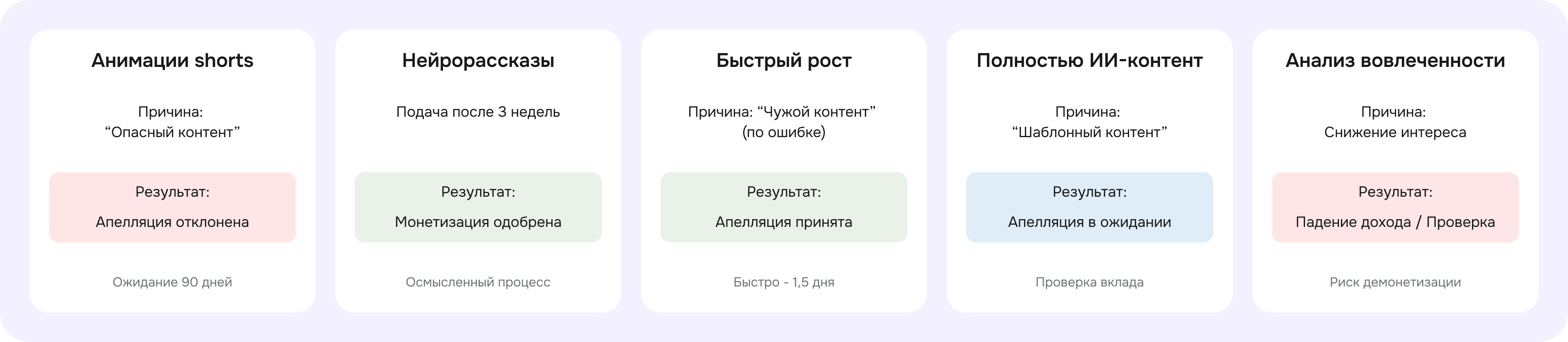 Три вещи объединяют случаи потери монетизации: быстрый рост привлекает проверку, однотипный визуальный ряд — красный флаг, формулировки отказа часто не совпадают с реальной причиной.