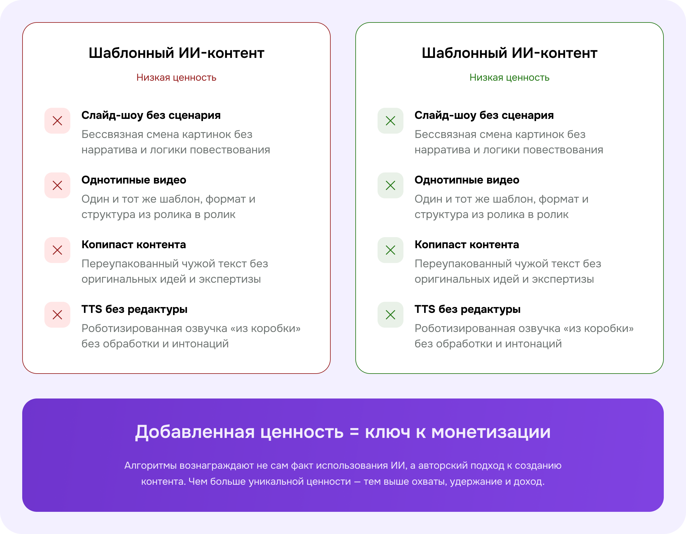 Главная причина отказа в монетизации ИИ-каналов — не сам факт использования нейросетей, а однотипность контента: одинаковые шаблоны без вариации формата, стиля и подачи.